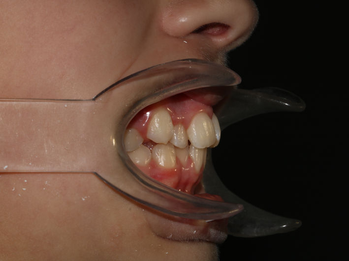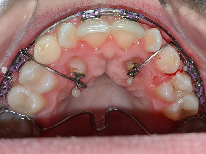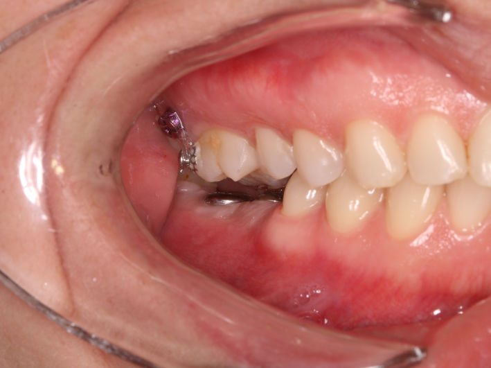 Pacienta se prezinta în cabinet pentru a trata leziunea de la nivelul molarului inferior. Analizând ocluzia observăm absența spațiului suficient pentru o lucrare corectă. Astfel, am aplicat un aparat dentar local cu mini-implanturi pentru a intruza molarul superior si a recâștiga spațiul necesar.