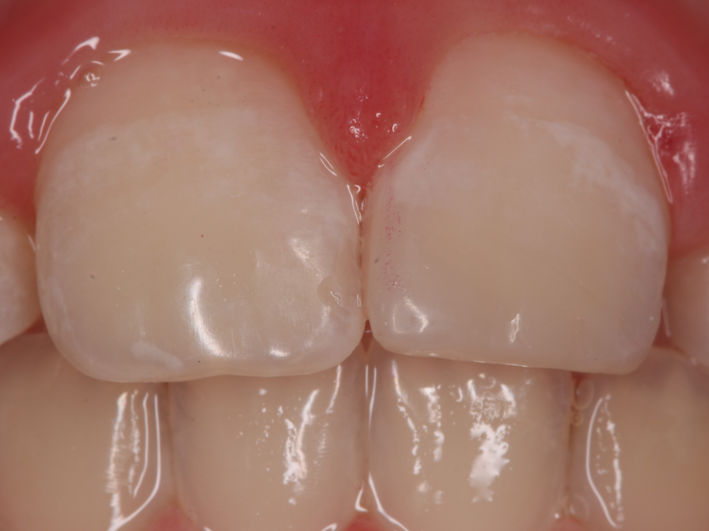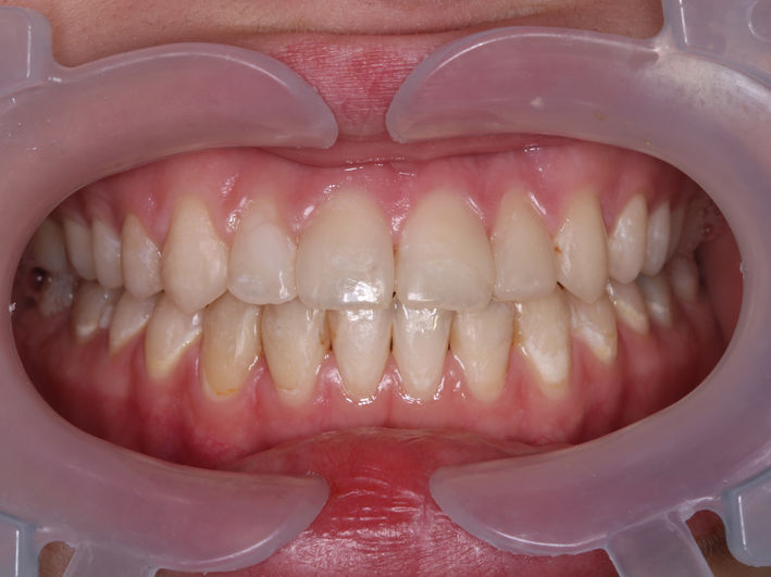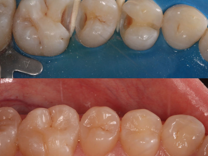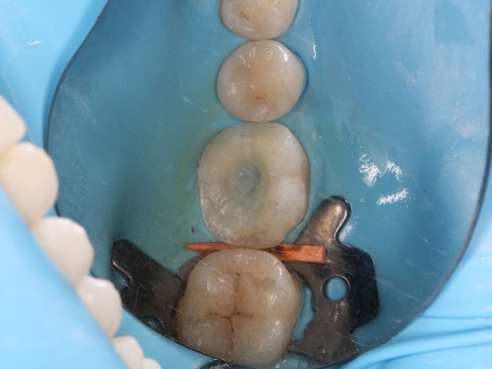 După tratamentul ortodontic și câștigarea spațiului necesar am preparat minim dintele, am luat amprentă și tehnicianul a realizat un onlay din material compozit. Acesta a fost lipit sub izolare cu digă.