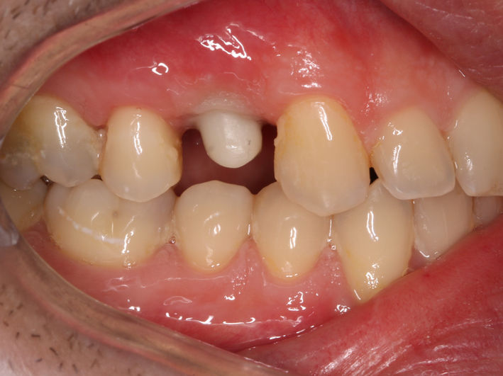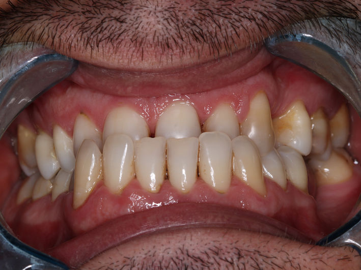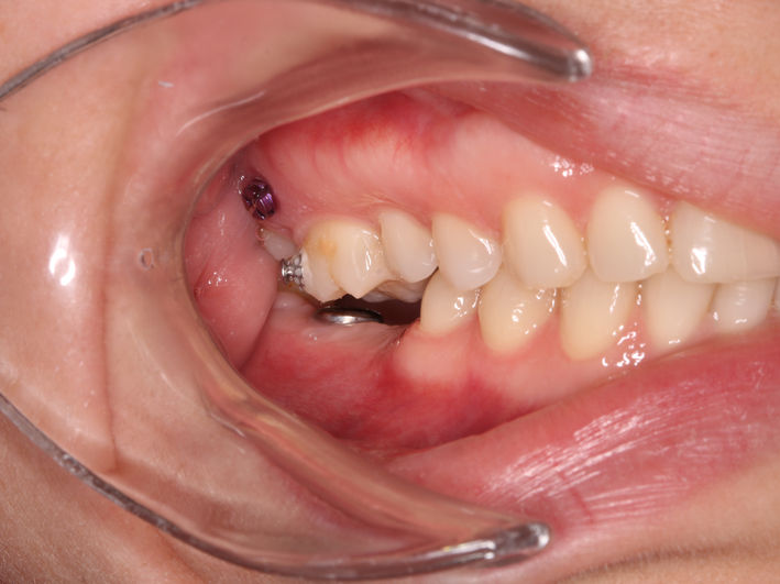 Pacientul se prezintă în cabinet pentru a trata absența a doi molari inferiori. Problema ridicată este aceea că acei molari au fost extrași în urmă cu mult timp iar molarii superiori au ”coborât” nelăsând spațiu suficient pentru a pune coroane de o formă și înălțime corectă pe implanturi. O soluție ar fi aceea de a scoate nervul și a se șlefui dinții de sus pentru a face spațiu. Noi am ales o altă variantă: am pus aparat dentar cu mini-implanturi, am intruzat dinții de sus si am creat astfel loc pentru coroane corecte pe implanturi.